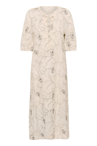 - OBS! Fjernlager. Levering kan blive forlænget med 2-3 dage, hvis varen ikke findes i vores butik lige nu.Flot kjole fra ½ lange ærmer, v-udskæring i halsen med et lille bindebånd og et flot enkelt print.