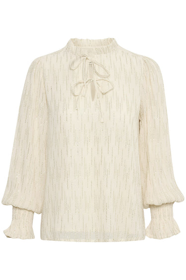 OBS! Fjernlager. Levering kan blive forlænget med 1-2 dage, hvis varen ikke findes i vores butik lige nu.Super fin bluse fra Part Two med lange ærmer, rund hals der bindes over brystet med små bånd, tætsiddende smock manchetter og et skønt print med glimmerdetaljer.