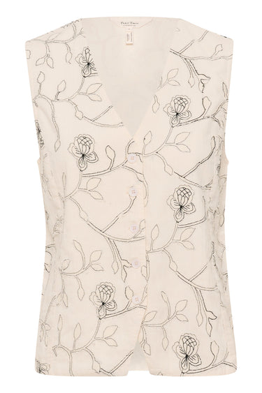 - OBS! Fjernlager. Levering kan blive forlænget med 2-3 dage, hvis varen ikke findes i vores butik lige nu.Elegant top fra Part Two med v-udskæring i halsen og super fine broderet detaljer.