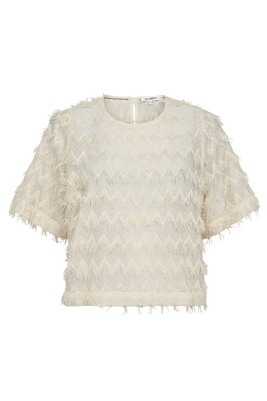 OBS! Fjernlager. Levering kan blive forlænget med 2-3 dage, hvis varen ikke findes i vores butik lige nu.Smuk bluse fra Co'couture med korte ærmer, rund hals og et super fint mønster med skønne frynser.