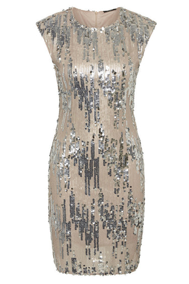 OBS! Fjernlager. Levering kan blive forlænget med 2-3 dage, hvis varen ikke findes i vores butik lige nu.Elegant kjole fra Bruuns Bazaar med rund hals, små ærmer og et smukt mønster med flotte pailletter. Kjolen har også en diskret lynlåslukning i ryggen og en figursyet pasform.