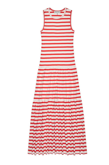 OBS! Fjernlager. Levering kan blive forlænget med 2-3 dage, hvis varen ikke findes i vores butik lige nu.Blød lang rib kjole fra Munthe med fine klassiske striber og elegante overskæringer i skørtet på kjolen. Denne kjole er lavet af 100% økologisk bomuld.