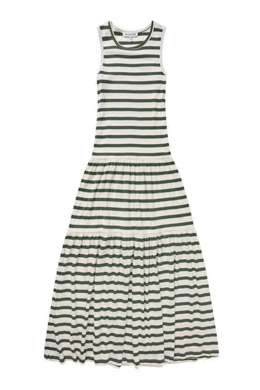 OBS! Fjernlager. Levering kan blive forlænget med 2-3 dage, hvis varen ikke findes i vores butik lige nu.Blød lang rib kjole fra Munthe med fine klassiske striber og elegante overskæringer i skørtet på kjolen. Denne kjole er lavet af 100% økologisk bomuld.