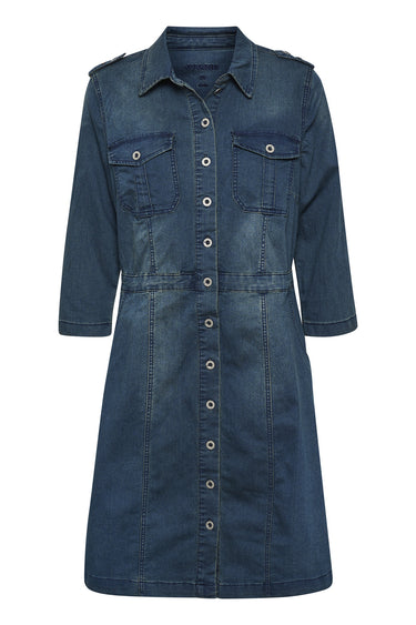 OBS! Fjernlager. Levering kan blive forlænget med 2-3 dage, hvis varen ikke findes i vores butik lige nu.Cool denim kjole fra Cream med ¾ lange ærmer, skjortekrave i halsen og lommer på brystet.Kjolen har også et feminint snit og knaplukning foran.