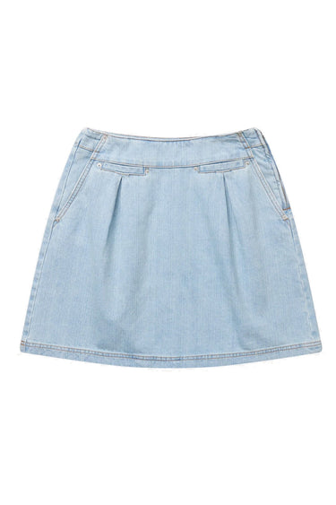 OBS! Fjernlager. Levering kan blive forlænget med 2-3 dage, hvis varen ikke findes i vores butik lige nu.En kort denim nederdel fra Munthe, designet med elegante små læg og lommer foran. Nederdelen er designet med lynlås i siden og bæltestropper.