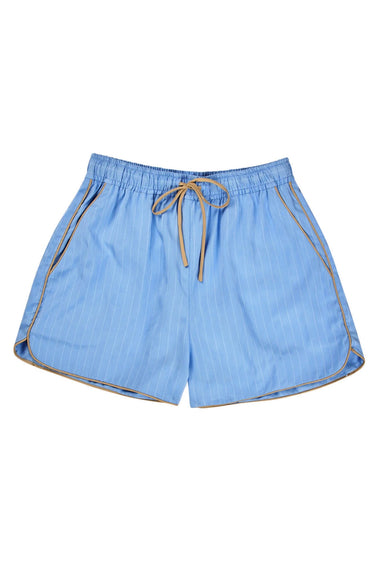OBS! Fjernlager. Levering kan blive forlænget med 2-3 dage, hvis varen ikke findes i vores butik lige nu.Elegante nålestribede shorts fra Munthe med smukke hvide piping bånd. Bukserne har lommer, og bindes med et fint bindebånd i taljen.