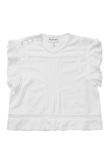 OBS! Fjernlager. Levering kan blive forlænget med 2-3 dage, hvis varen ikke findes i vores butik lige nu.Elegant broderi anglaise top fra Munthe med smukke broderet detaljer og flotte små perler på den ene skulder.