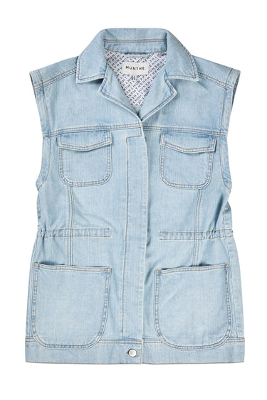 OBS! Fjernlager. Levering kan blive forlænget med 2-3 dage, hvis varen ikke findes i vores butik lige nu.Smart denim vest fra Munthe med en løs silhuet, fine lommer på fronten og skjult knaplukning foran.Vesten har også snøre i taljen og en lækker bomuldskvalitet.