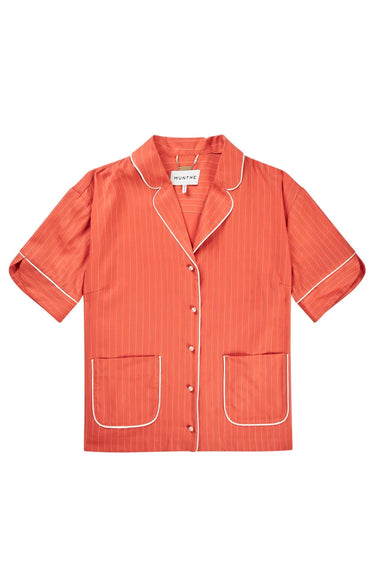 OBS! Fjernlager. Levering kan blive forlænget med 2-3 dage, hvis varen ikke findes i vores butik lige nu.Nålestribet skjorte fra Munthe bluse med smukke hvide piping bånd, og elegante perle knapper. Skjorte blusen er designet med 2 fine lommer og elegante detaljer på ærmet