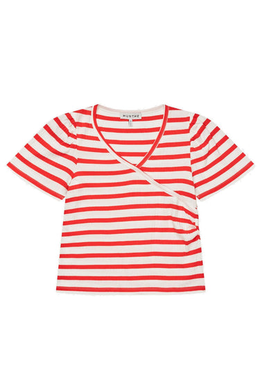OBS! Fjernlager. Levering kan blive forlænget med 2-3 dage, hvis varen ikke findes i vores butik lige nu.Stribet T-shirt fra Munthe i 100% økologisk bomuld med en elegant slå om effekt. Denne T-shirt har en normal pasform og korte ærmer med et let puf ved skulderen.