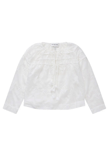 OBS! Fjernlager. Levering kan blive forlænget med 2-3 dage, hvis varen ikke findes i vores butik lige nu.Bluse fra Munthe med fine broderede blomster samt smukke bindebånds detaljer ved brystet. Hvert bindebånd afsluttes elegant med små farvede kvaster. Blusen er designet med lange ærmer og har et almindeligt fit.