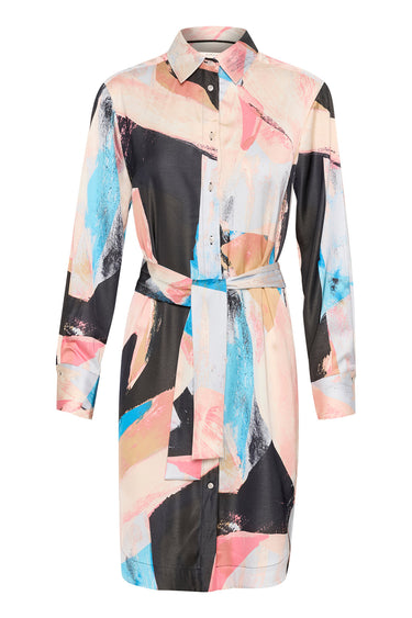 - OBS! Fjernlager. Levering kan blive forlænget med 2-3 dage, hvis varen ikke findes i vores butik lige nu.Flot skjortekjole fra InWear med lange ærmer, krave i halsen og knaplukning langs fronten.Kjolen har også et bredt bindebælte i taljen og et smukt abstrakt print.