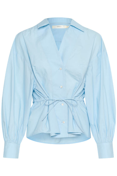 - OBS! Fjernlager. Levering kan blive forlænget med 2-3 dage, hvis varen ikke findes i vores butik lige nu.Feminin skjortebluse fra InWear med lange puffede ærmer, v-udskæring og krave halsen samt knaplukning langs fronten.Blusen er også detaljeret med et smalt bindebånd i taljen.