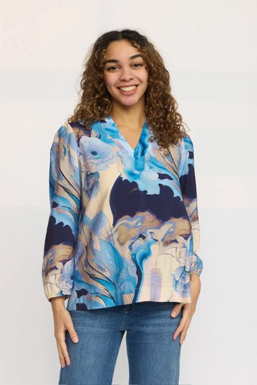 - OBS! Fjernlager. Levering kan blive forlænget med 2-3 dage, hvis varen ikke findes i vores butik lige nu.Flot bluse fra 2-Biz med lange ærmer, v-udskæring i halsen og et smukt abstrakt print.