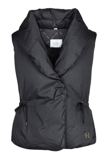 - OBS! Fjernlager. Levering kan blive forlænget med 2-3 dage, hvis varen ikke findes i vores butik lige nu.Skøn vatteret vest fra Hést med en super lækker kvalitet, en smart krave i halsen og justerbare klatresnore i taljen.