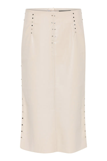 - An elegant high-waisted pencil skirt in vegan leather with stud details and slits on the sides, creating a modern and sophisticated look. Perfect for both the office and festive occasions.Style with a fitted shirt and high heels for a classic business look, or add a chunky knit and boots for a more relaxed and modern expression.- High-waisted- Side slits- Stud details- Vegan leather