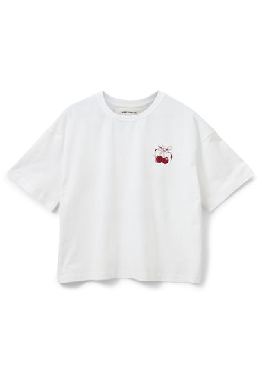 - OBS! Fjernlager. Levering kan blive forlænget med 2-3 dage, hvis varen ikke findes i vores butik lige nu.Cool tee fra Sofie Schnoor med korte ærmer, rund hals og en skøn broderet detalje på brystet samt et flot print på ryggen.