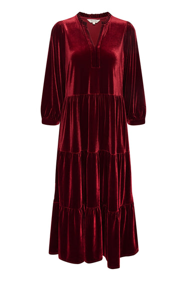 OBS! Fjernlager. Levering kan blive forlænget med 1-2 dage, hvis varen ikke findes i vores butik lige nu.Smuk fløjlskjole fra Part Two med ¾ lange ærmer, rund hal med en lille v-udskæring og flotte flæser i skørtet der giver den et rigtig fint udtryk. Kjolen har også en afslappet silhuet og en dejlig blød kvalitet der falder smukt langs kroppen.