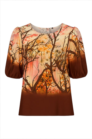OBS! Fjernlager\nLeveringen kan blive forlænget med 1-2 dage, hvis varen ikke er at finde i vores butik lige nu.\n\nModel VINA.EA25 BLUSER VINA.EA25 BROWN LEAVES\n\n100% Viscose