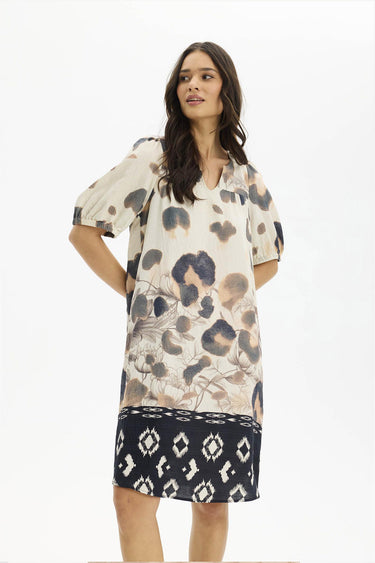 - OBS! Fjernlager. Levering kan blive forlænget med 2-3 dage, hvis varen ikke findes i vores butik lige nu.Skøn kjole fra In Front med ½ lange ærmer, rund hals med v-udskæring i halsen og et smukt print.