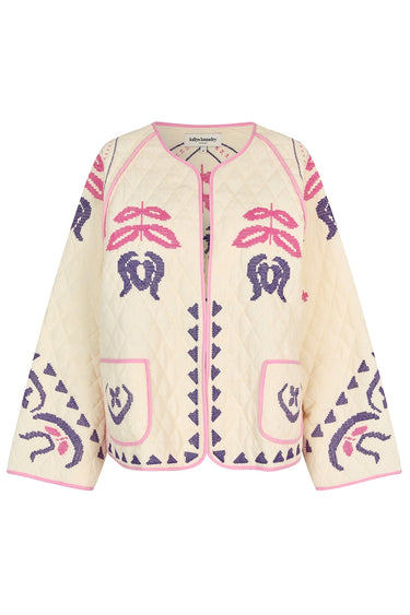 OBS! Fjernlager. Levering kan blive forlænget med 2-3 dage, hvis varen ikke findes i vores butik lige nu.En moderne boho-drøm af en jakke her fra Lollys Laundry.Den let vatterede jakke har smukke broderidetaljer i lilla og pink, som giver et farverigt og feminint twist. Med sine vide ærmer og afslappede pasform er den perfekt som statement-lag over alt fra en enkel T-shirt til en kjole, og den kan både bruges indenfor og som overgangsjakke.