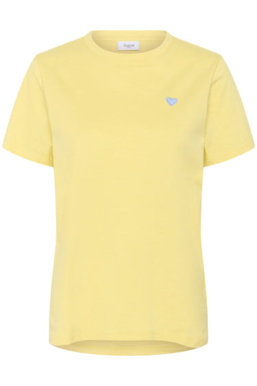- OBS! Fjernlager. Levering kan blive forlænget med 2-3 dage, hvis varen ikke findes i vores butik lige nu.Sød tee fra Saint Tropez med korte ærmer, rund hals og et fint broderet hjerte på brystet.