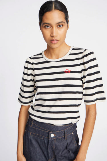 OBS! Fjernlager. Levering kan blive forlænget med 2-3 dage, hvis varen ikke findes i vores butik lige nu.Stribet T-shirt med et lille elegant feminint puf ærme og et smukt broderet MUNTHE emblem. T-shirten er lavet i 100% økologisk bomuld og designet med rund hals og lav skuldersøm.